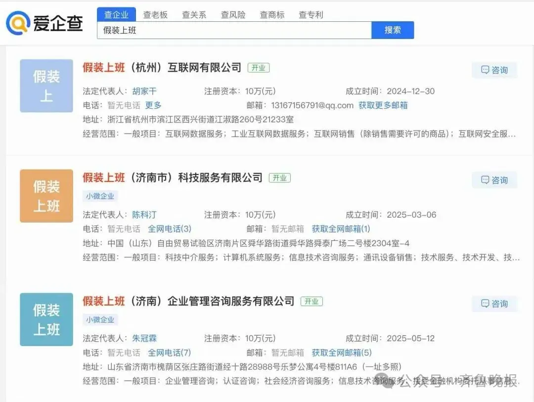 爱企查App显示,已有多家公司以“假装上班”命名,包括假装上班(杭州)互联网有限公司、假装上班(济南市)科技服务有限公司等。