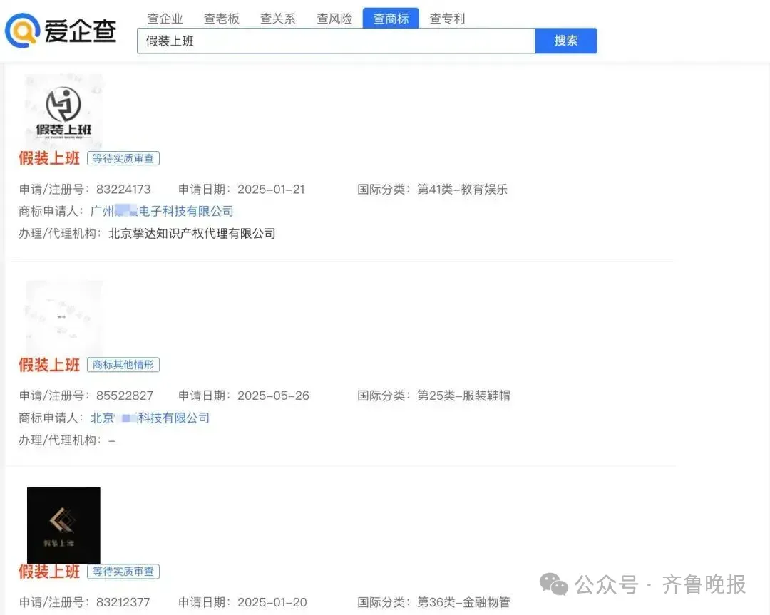知识产权相关信息显示,广州某电子科技有限公司、秦皇岛某文化传播有限公司、北京某科技有限公司等已申请多枚“假装上班”商标,国际分类涉及教育娱乐、金融物管、服装鞋帽等,目前上述商标多数为等待实质审查。